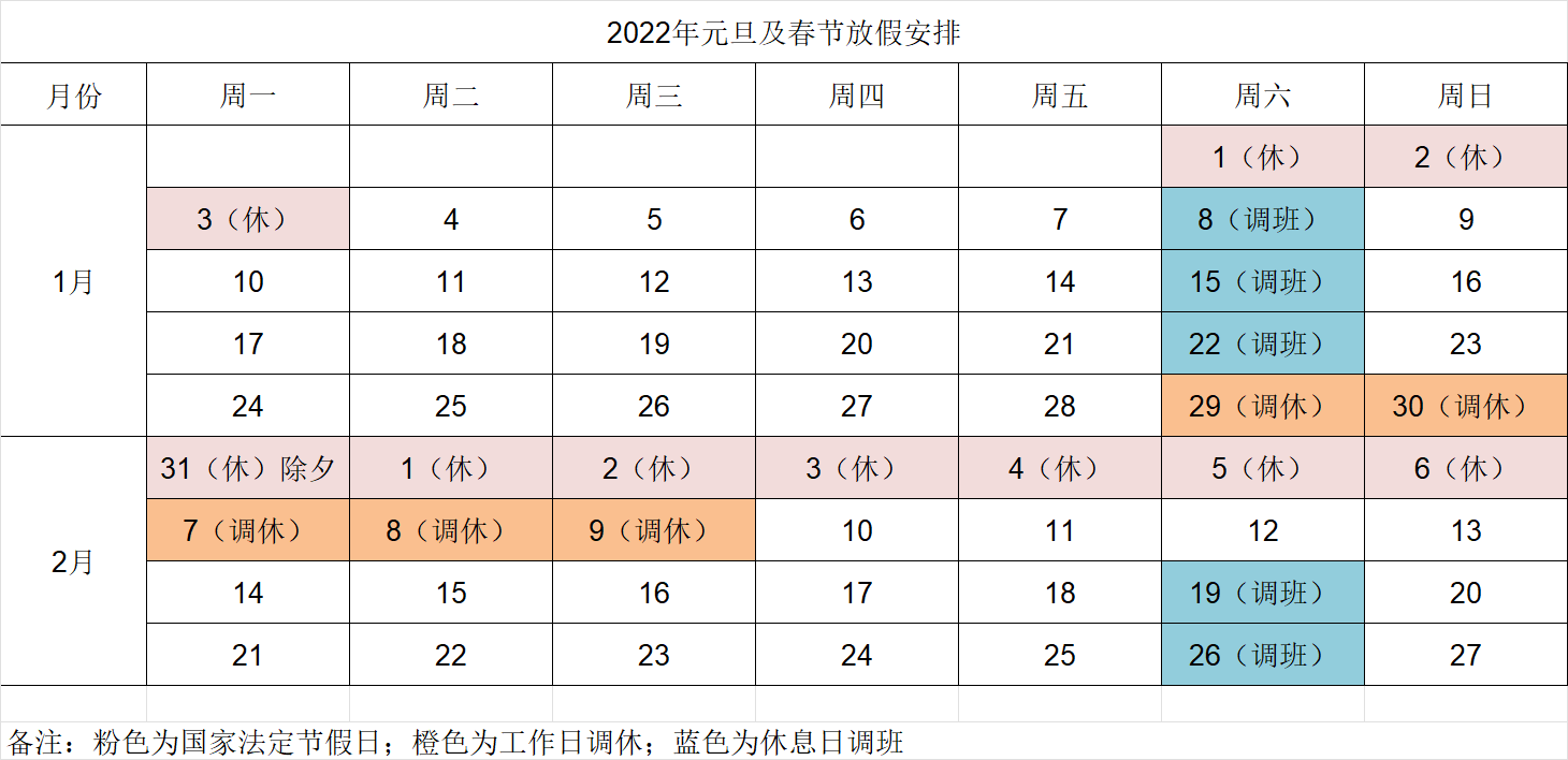 附錄:2022年元旦,春節放假日歷