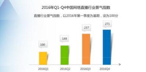 2016年我國(guó)的網(wǎng)絡(luò)直播行業(yè)實(shí)現(xiàn)了全年持續(xù)增長(zhǎng),以一季度100為基數(shù),第四季度中國(guó)網(wǎng)絡(luò)直播行業(yè)景氣指數(shù)為271,環(huán)比增長(zhǎng)14.34%,在經(jīng)歷了前三季度的爆發(fā)式增長(zhǎng)之后,中國(guó)網(wǎng)絡(luò)直播行業(yè)步入平穩(wěn)增長(zhǎng)期。