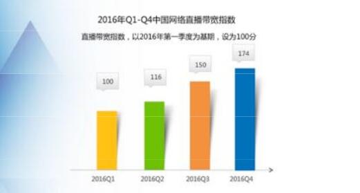 具體來(lái)看,延續(xù)前三季度網(wǎng)絡(luò)直播帶寬指數(shù)的持續(xù)增勢(shì),2016年第四季度中國(guó)網(wǎng)絡(luò)直播帶寬指數(shù)為174,環(huán)比增長(zhǎng)16%,與二季度的環(huán)比增速持平。