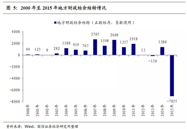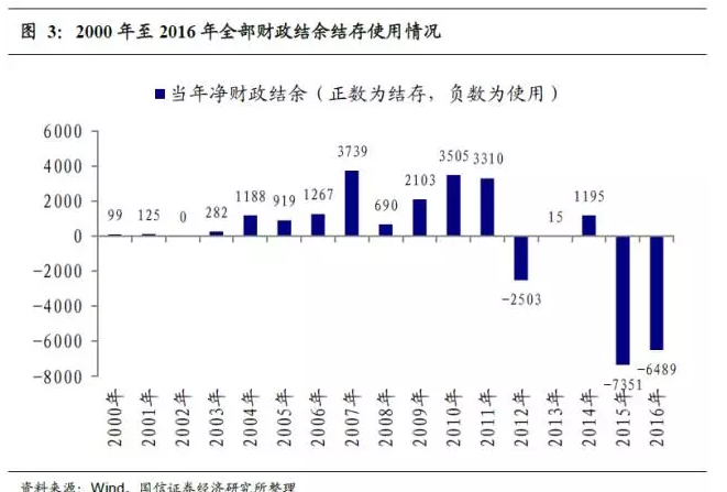 相反,“實際赤字”或者說“財政赤字-財政結余”占GDP的比重卻能夠較好地反映財政政策的積極程度。對財政結轉結余進行調整后,我們可以清晰的發現:由于大量使用財政結余(圖3),2015年和2016年連續兩年的財政刺激力度都要遠超2009年的水平,正是這個原因才使得我們的基建投資增速在已經很高的基數上還連續兩年保持了近20%的增速。